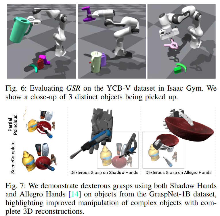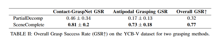 또한 parallel gripper와 dextrous hand를 통해 조작 가능성은 어느정도인지 평가를 진해했습니다. 시뮬레이터에서 YCB-Video 데이터셋과 GraspNet-1B를 gt삼아 복원한 객체들을 각각 CGNet(parallel), Antipodal Grasping (dextrous hand)를 활용해 평균적인 Grasping 성공률을 기준으로 평가했습니다. 결과는 PartialDecomp 대비 2배 이상 성공률이 상승했습니다.
