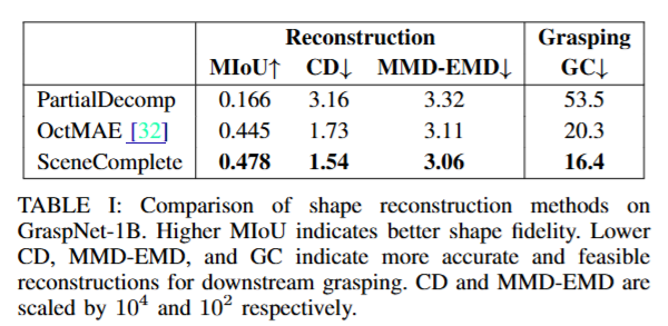 저자들은 성능을 세개의 실험을 통해서 평가했습니다. 먼저 가장 처음으로는 Scene Reconstruction and Grasping 실험을 진행했습니다. GraspNet-1B 데이터셋을 활용해 SceneComplete를 기존의 단일 뷰 기반의 Scene Reconstruction 기법과 비교했습니다. 비교대상은 OctMAE라는 방법론인데, 3D mesh를 복원하는 파이프라인은 저자들이 처음으로 제시했기 때문에 OctMAE의 occupancy map을 기반으로 uniform하게 pointcloud를 생성 후에 메시화해서 진행했다고 합니다. 평가지표로는 MIoU, Chamfer Distance와 MMD-EMD를 사용했습니다. CD의 경우 한 pcd의 모든 점에서 비교대상 pcd와의 최소 거리의 평균입니다. Earth Mover’s Distance – Maximum Mean Discrepancy (MMD-EMD)는 두 pointcloud 간의 분포 차이를 정량화해서, 하나의 분포를 다른 분포로 변환하는 데 필요한 최소 이동 비용을 평균적으로 계산한 값이라고 합니다. GraspingGC같은 경우는 복원한 대상으로 다수의 grasping 후보를 만든 뒤 해당 후보들이 gt에서도 유효한 grasping point가 되는 확률이라고 합니다. 결과는 아래 table1으로 확인 가능합니다. 다른 방법론들과 비교했을 때 전반적으로 우수한 성능을 보입니다.