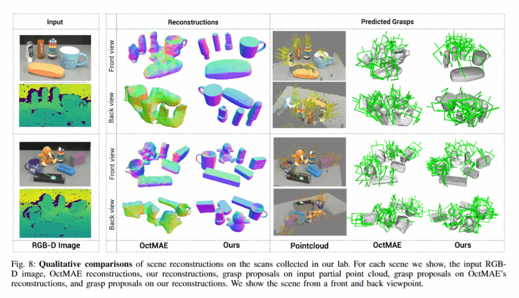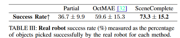 마지막으로는 Real World에서 평가를 진행했습니다. 현실에서 Franka Panda와 Realsense D435 카메라를 이용해 pick and place 실험을 진행했고, 15개의 실제 table top scene에서 scene reconstruction을 진행한 뒤 pick and place 실험을 진행했다고 합니다. 이 때도 기존의 방법론들을 크게 앞서는 성능을 볼 수 있습니다. 평가 지표는 success rate입니다. OctMAE의 경우 YCB와 같은 일상적인 물체에 대해 복원력이 크게 떨어졌다고 합니다.