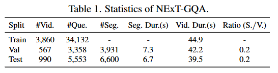 저자는 위 질문들에 대한 대답하기 위해 새로운 데이터셋을 제안합니다. 저자가 제안하는 NExT-GQA 데이터셋은 기존에 많이 평가되던 데이터셋인 NExT-QA 데이터셋을 확장한 데이터셋으로 답변에 근거가 되는 구간을 사람이 직접 라벨링한 데이터셋입니다. 아래 Table1은 제안하는 NExT-GQA의 통계를 보여주고 있으며 주목할만한 점은 Train셋에 Grounding 라벨이 없다는 점입니다. 이는 저자의 접근이 Weakly이기 때문입니다. 즉, Question에 대한 답변만을 학습에 활용할 뿐 답변에 대한 근거가 되는 구간의 정보는 학습에 활용하지 않습니다.
