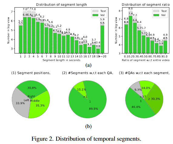 Figure2는 NExT-GQA 데이터셋의 validation셋과 test셋의 grounding GT에 대한 정보를 보여줍니다. 구간의 위치가 특정 위치에 편향되어있지 않아 제안하는 데이터셋이 벤치마크로서 기능하기에 충분하다는 것을 보여줍니다.