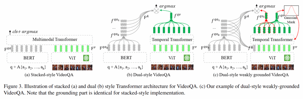 Figure3의 (a)와 (b)는 기존 VideoQA 모델들의 구조입니다. (c)는 저자가 lightweight 모듈을 더한 구조로 Grounding 능력을 강화하는 방법입니다. (a) Stacked-style은 심플하게 각각 질문과 비디오를 인코더를 거친 후에 Multimodal Transformer를 통해 질문에 대한 답변을 생성하는 것으로 가장 간단하면서도 효과적인 방법입니다. 다만, 연산량이 크고 큰 Multimodal Transformer를 사용해야 어느정도 성능이 나온다는 단점이 있습니다. (b) Dual-style은 각각의 모달리티를 서로 특징을 추출한 후에 비디오 특징을 Temporal Transformer를 통해 시간 정보를 주입합니다. 그 후 전체 영상의 특징을 추출해 질문, 답변과의 유사도를 기반으로 정답을 예측하는 방법입니다.