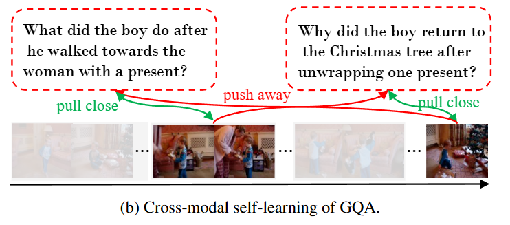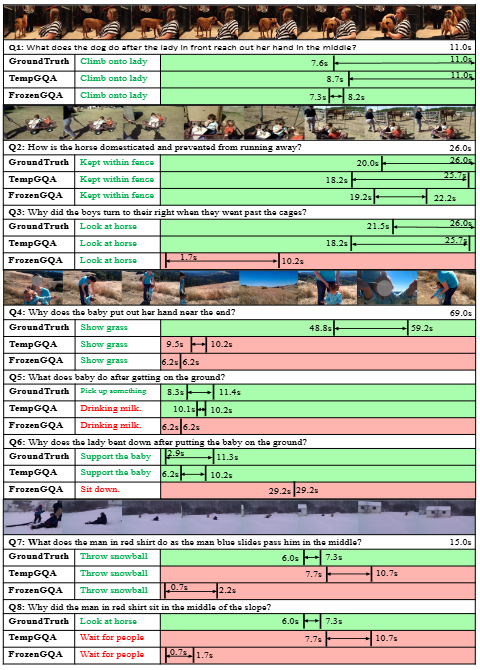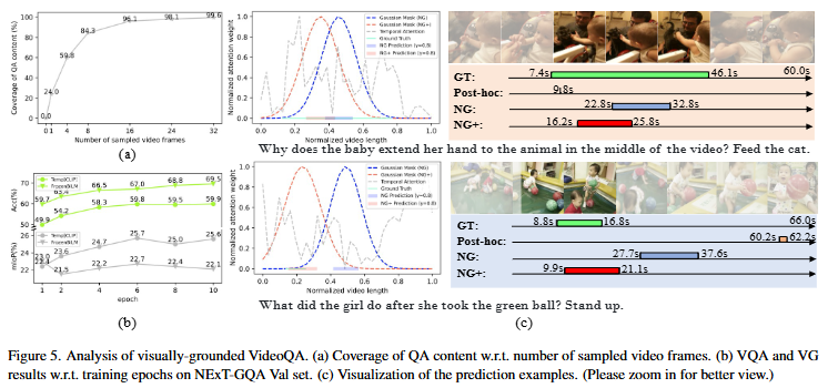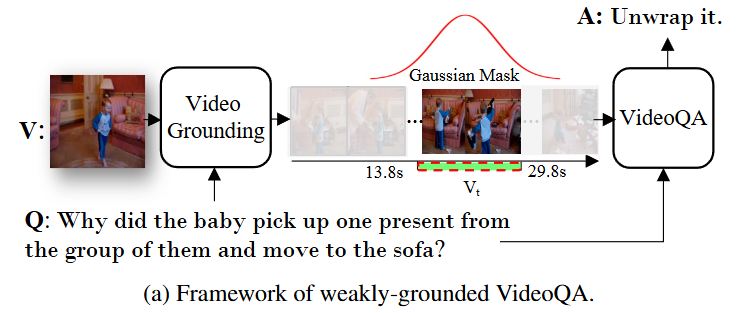 저자는 위와 같은 Gaussian Masking과 contrastive learning을 통해 기존 VideoQA모델도 Grounding 능력을 갖출 수 있게 되었으며, 단순히 답변을 생성하는 것이 아니라 비디오의 어느 구간에서 답변의 근거를 갖추게 되었는지를 설명할 수 있게 되었다고 설명합니다.