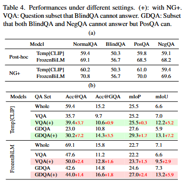 위 실험에서의 NormalQA는 기존의 VideoQA 방식입니다. BlindQA는 비디오를 제공하지 않은 상황에서 질문만을 통해 답변을 생성하는 평가방식입니다. PosQA는 positive 질문을 NegQA는 negative 질문을 통해 답변을 생성하는 평가방식입니다. 저자는 만약 기존 모델들이 시각적 정보를 기반한 답변을 생성하고 있었다면, NormalQA에서의 성능과 BlindQA의 성능 차이가 심해야하고, PosQA와 NegQA의 성능 차이가 심해야한다고 설명합니다.