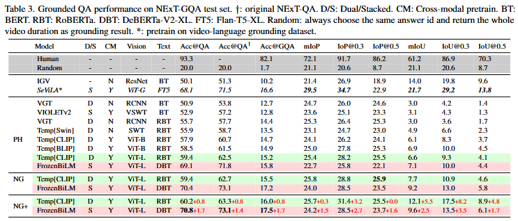 TempCLIP은 dual-style의 VideoQA이고, FrozenBiLM은 stacked-style의 VideoQA 모델입니다. 두 모델 모두 저자의 예상대로 성능차이가 심하지 않고 둘 모두 비슷한 성능을 기록하고 있는 것을 통해 기존의 모델들은 시각적 정보를 통해 답변을 생성하는 것이 아니라 시각적 정보를 참고하지 않더라도 자연어 이해능력을 통해 답변을 생성하고 있다고 설명하고 있습니다. 즉, Language Understanding 능력에 편향되어 시각적 정보는 크게 참조하지 않더라도 답변을 생성하고 있는 것을 의미합니다. 저자는 이것은 잘못되었음을 지적하고 Grounding의 중요성을 강조합니다.