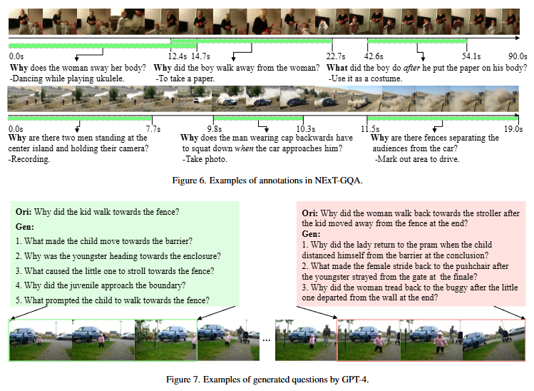 위는 저자가 라벨링한 NExT-GQA 데이터셋의 실제 예시와 GPT4를 통한 positive 질문들을 rephrasing을 통해 생성한 예시입니다.