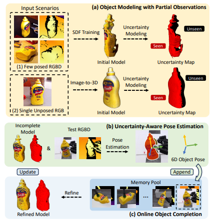 이 논문은 기존에 방식들의 문제점들을 해결하고 uncertainy-aware한 방법을 통해서 pose estimation과 object completion을 동시에 수행하는 논문입니다. 자세히 말씀드리면 reference이미지들이 불완전하다는 가정하에 3D 모델의 unseen영역에 대한 불확실성을 모델에게 알려주고 이를 기반으로 pose 신뢰도를 판단해서 object모델을 점진적으로 보완해 나가는 구조입니다.