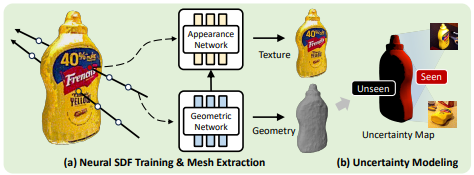 5. neural SDF, apperance net, geometric net 모두 학습하는 network가 맞나요? 학습 시그널을 어떻게 준다는 건지 잘 모르겠습니다. loss 수식 설명이 필요한 것 같아요..
