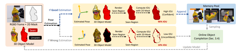 앞서 설명드린 것처럼 매 프레임마다 6D pose를 예측하고 이 중에서 Uncertainty Rate와 Seen IoU가 모두 높은, 즉 신뢰할 수 있는 pose만 Memory Pool에 저장하게 됩니다. 이렇게 누적된 정보는 현재 프레임의 pose예측 결과가 신뢰하기 어려운 경우에 memory pool바탕으로 다시 object를 완성시키는 과정을 수행하게 됩니다.