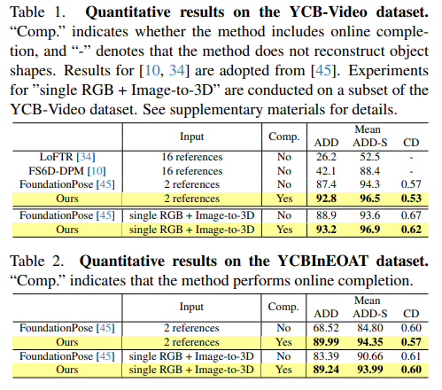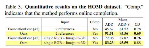 실험 결과 2 reference 또는 단일 RGB , image-to-3D 에서 ADD 및 ADD(-s)성능이 기존 FoundationPose를 넘겼습니다 특히 online completion을 추가함을써 geometry 복원성능인 chamfer distance 까지도 개선되었음을 보였습니다. 저자는 chamfer Distance를 통해서 불완전한 관측만으로 구성된 초기 3D object 모델이 online completion을 거치면서 얼마나 정확히 보완되는지를 정량적으로 보여주었습니다.