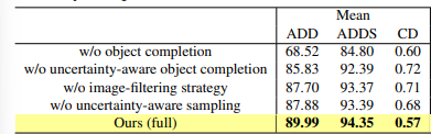 ablation study 결과를 보면, object completion이 성능 개선에 가장 큰 영향을 준 것으로 보입니다. object completion이 이루어지지 않았을 때 Uncertainty-aware Pose Estimation가 성능을 보완할 수 있는 것 같은데, 이에 대한 실험 결과는 어떤 것을 보면 될 지 궁금합니다. 4가지 요소에 대하여 하나씩 빼는 것 말고 조합에 대한 결과가 궁금한데 이는 따로 리포팅 된 결과가 없을까요?
