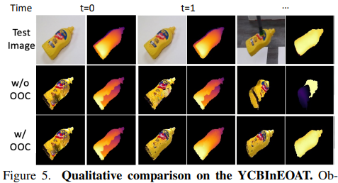 정성적 자료입니다 OOC가 없는 경우에는 occlusion 영역이나 뒷면이 복원되지 않아서 뚫린 geometry가 그대로 유지되는 반면 OOC를 적용한 경우는 새로운 시점에서 관측된 정보들이 점차 통합되면서 더 완성도 높은 object model이 구성되는 걸 확인할 수 있습니다. 특히 t=1 이후에는 두 방법의 결과가 명확히 갈리는 모습이 눈에 띕니다