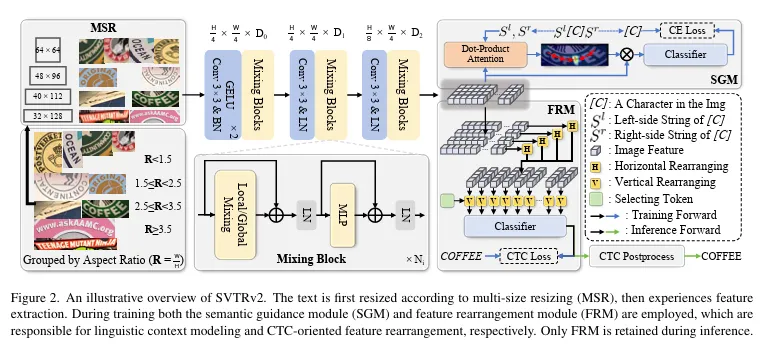 위는 SVTRv2의 전체 모델 구조를 나타낸 것이다. MSR을 통해 우선 입력된 이미지는 이미지의 종횡비에 맞게 크기가 조정된다. 3차례의 특징 추출 단계를 통과하며 visual feature 를 추출한다. 학습 때는 추출된 feature를 SGM, FRM에 둘 다 입력한다. SGM은 해당 모델로 부터 텍스트가 가지는 의미를 파악하고 활용할 수 있게 하고 FRM은 추출된 visual feature map은 2D인데 이를 순서를 갖는 시퀀스로 변환하는 역할을 한다. inference 시에는 SGM은 사용되지 않는다.