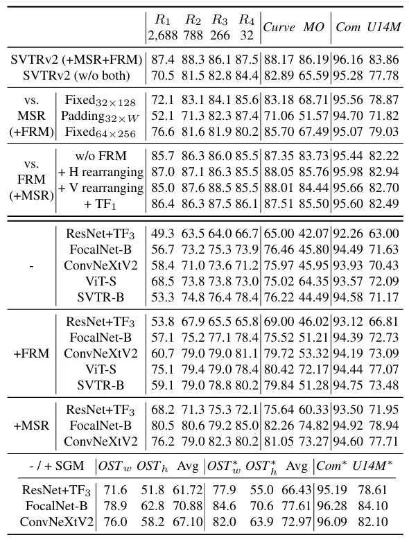 FRM은 방향에 따라 수직, 수평 방향의 정렬 모듈로 나눠볼 수 있는데 특히 비정형 텍스트로 구성된 Curve, MO 데이터셋 결과를 같이 보면 FRM을 전혀 사용하지 않은 것과 비교해서 각각의 모듈을 추가함으로써 각각에서의 성능 향상을 보이는 것을 확인할 수 있다. 그리고 대신 Transformer block을 사용했을 때는 향상 폭이 저조했다. text irregulary에 대해서 강인함을 알 수 있다.
