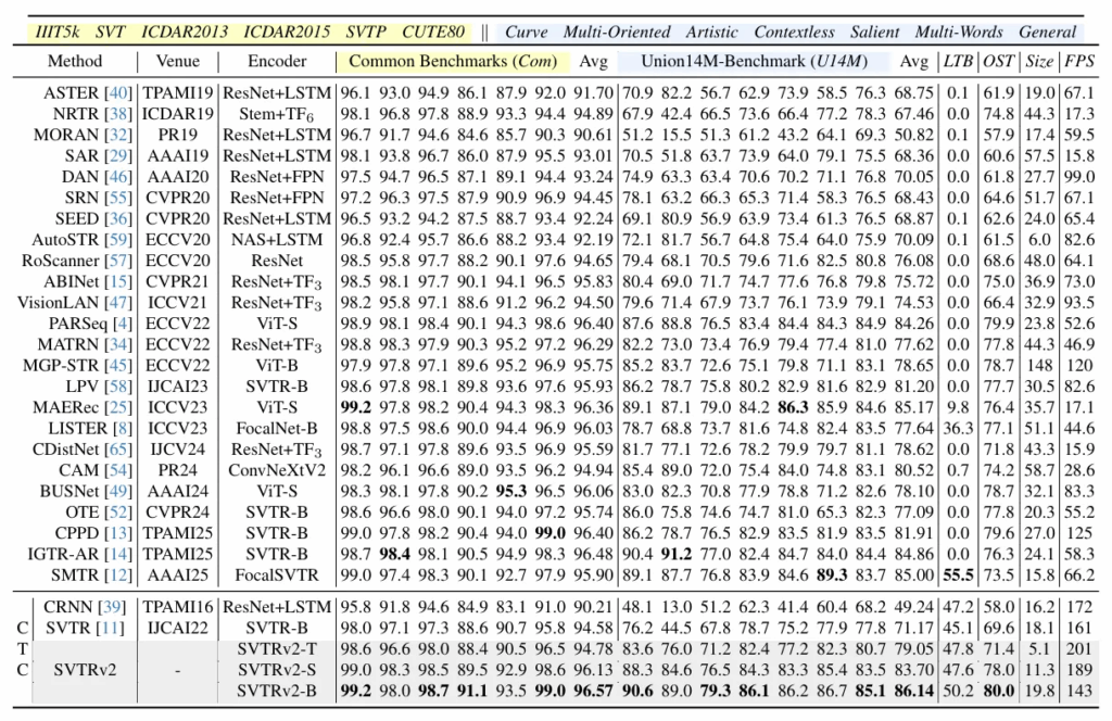 안녕하세요 2025년 ICCV에 accept된 Scene Text Recognition (STR) 논문 중 한 편인 SVTRv2을 가져왔습니다. 기존에 많이 사용됐던 CTC 기반의 방법론에 모듈을 추가해 트랜스포머 기반의 text recognizer를 능가하는 성능을 기록하는 모델을 제안한 연구입니다. 그래서 기존에 CTC 모델이 갖던 빠른 추론 속도, 간단한 구조의 장점은 그대로 가져가면서도 기존 CTC 기반 방법론들이 해결하기 못하던 걸 해결한 연구입니다. 아래에 바로 리뷰하겠습니다.