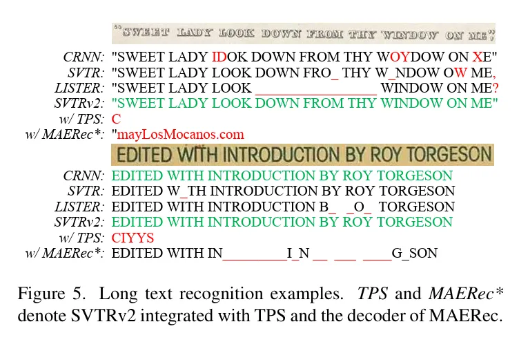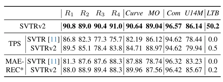 또한 긴 텍스트가 있는 데이터셋 LTB에 대한 정량적 결과와 정성적 결과를 함께 살펴보면 rectification 모듈을 사용한 것과 attention decode를 사용한 것의 결과가 현저히 낮은 한 편 SVTRv2의 정확도는 비교적 꽤 큰 차이로 높다는 것을 확인할 수 있다. 이로써 SVTRv2이 비정형 텍스트에 대해 충분히 강인하게 인식 정확도를 갖는다고 할 수 있지 않을까 싶다.