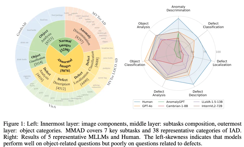 본 논문은 industrial anomaly detection 문야에서 mllm 모델들의 성능을 평가하고자 MMAD라고 하는 새로운 벤치마크 데이터셋을 제안한 논문입니다. 기존 industrial anomaly detection(이하 IAD) task에서 주로 연구되던 모델들은 discriminative model이라고 볼 수 있는데요. 이런 모델들은 단시 학습한 그 detection task 작업만 가능하고, 그 제품에 대한 디테일한 설명은 하지 못했습니다. 또, 약간의 세팅이 바뀌는 경우에는 전체 모델을 다시 학습하거나 다시 개발해야 한다는 단점을 갖고 있었습니다. 하지만, 최근에는 MLLM이 발전되고 있고, 이를 IAD task에 적용해볼 수 있겠죠. 따라서 본 논문 저자들은 이런 질문을 던지게 됩니다. “How well re current MLLMs performing as industrial quality inspectors?” 직역하자면 현재 MLLM들이 산업 현장에서의 품질 검사 모델로 사용하기에 어느 정도의 성능을 보이냐는 것이죠.