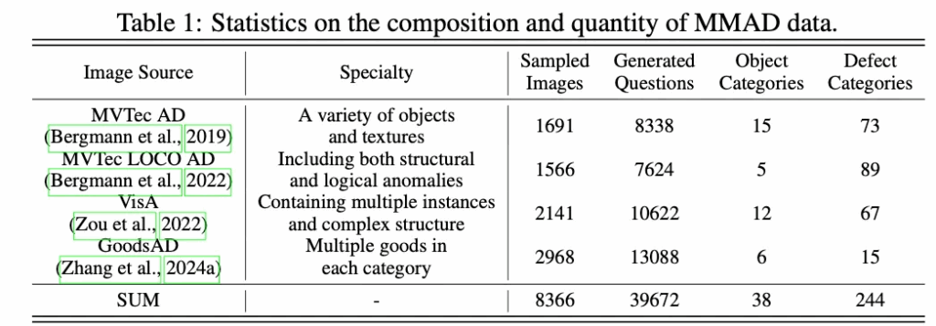 먼저 MMAD 데이터셋에 대해 자세하게 살펴보도록 하겠습니다. 산업 환경에 품질 검사를 위해 적용될 모델이라고 하면, 제품의 종류가 다르다고 하더라도 시각적인 검사에 필요한 skill이 유사하기에 다양한 제품의 검사 업무에 유연하게 적용할 수 있어야 한다고 합니다. 따라서 MMAD 벤치마크는 여러 IAD 시나리오를 포괄하도록 설계가 되었습니다. 구체적으로, 서로 다른 4개의 IAD 데이터셋에서 데이터를 수집하고 샘플링하여 총 38개의 제품 class와 이에 대한 244개의 결함 유형을 포함하도록 구성을 하였는데 디테일하게는 아래 table1을 참고하시면 됩니다.