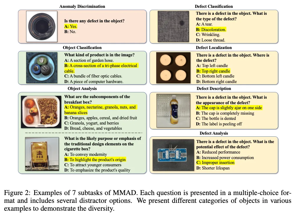 다음으로는, MMAD 벤치마크의 question 유형들을 살펴보도록 하겠습니다. 이 부분은 실제 산업 현장에서의 생산 라인에서 품질 검사를 할 때는 단순 결함 유무만 확인하는 것이 아니라, 결함의 종류도 분류하고, 그 정도를 판단해 원인을 분석하거나 그 결함에 대한 진단도 수행한다고 합니다. 이런 점을 고려하여 MMAD에서도 단순 이상 탐지 외에 아래 Fig2에 나와있듯이 총 7가지 subtask를 설계하였습니다.