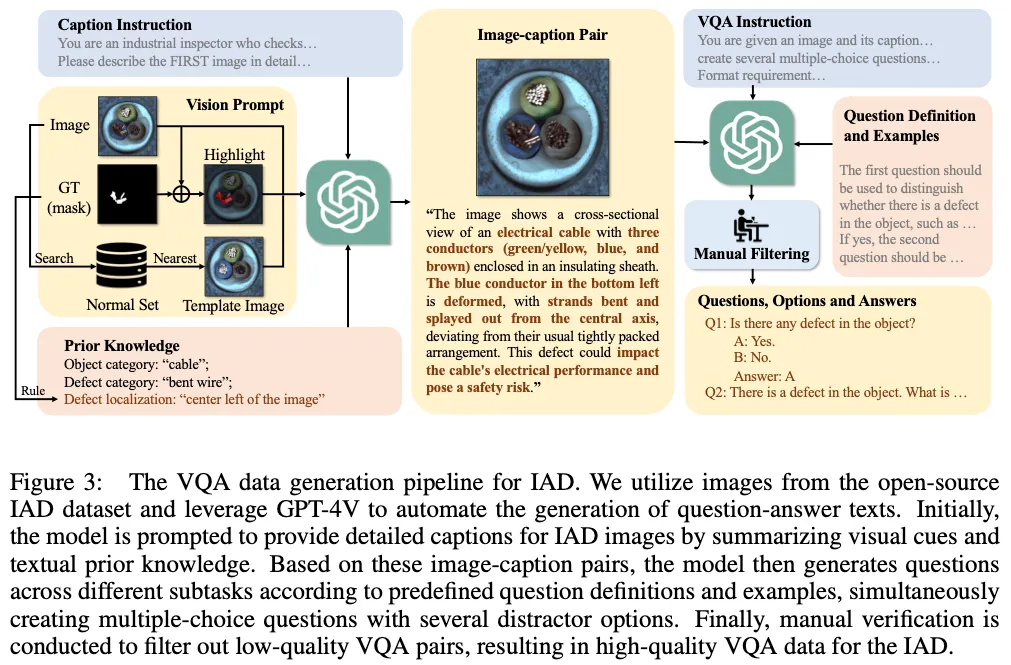 이렇게 vision prompt와 caption instruction, prior knowledge를 GPT-4V에 입력으로 넣어서 Caption이 생성된다면, 사전에 정의했던 7개의 subtask(2.2에서 언급했던 subtask들)에 따라 질문과 보기, 정답을 생성합니다. 이때 일반적인 natural image와는 다르게 각각의 IAD image에는 여러 질문이 동시에 생성된다고 하며, 이 샘플들은 모두 사람이 manually하게 filtering하는 작업을 거쳤다고 합니다.