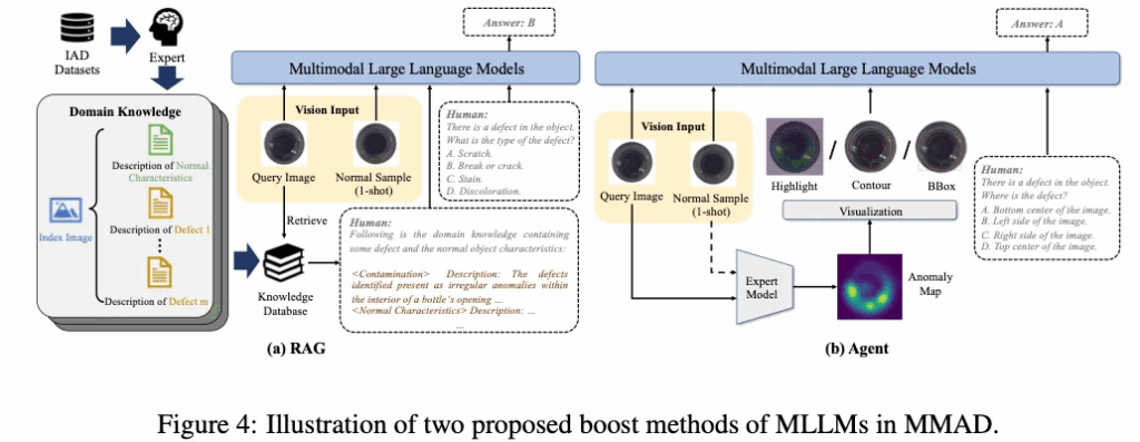 다음으로는 expert agent인데요. 이는 Fig4(b)에 나와있습니다. 보시면, 여기서는 기존 IAD 모델을 visual expert로 간주를 했는데, 이 IAD 모델이 output으로 뱉는 anomaly map 자체는 MLLM이 직접적으로 이해하기 어렵기 때문에 이를 시각적으로 보인 다음에 input image로 넣는 부분입니다. 즉, anomaly map 자체는 anomaly가 있는 영역을 highlight하고 있으니, 이를 원본 이미지에 합쳐 highlight하거나, contour하거나 bbox로 표시해서 MLLM input으로 넣는다는 것이죠. 이에 대한 실험은 아래 실험단에서 살펴보도록 하겠습니다.