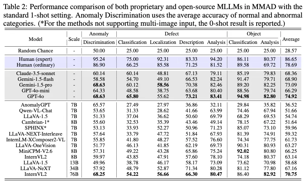 실험에서 사용한 상용 모델은 API를 통해 평가했으며, 구체적인 버전은 Claude-3.5-sonnet, Gemini 1.5 flash/pro, GPT-4o, GPT-4o-mini입니다. 평가 subtask중에 anomaly discrimination 같은 경우 단순 normal인지 anomaly인지 판단하는 binary classification이라고 보면 되는데 이 샘플 비율이 불균형하기 때문에 각 class에 대해 별도로 정확도를 측정한 다음 평균을 내어 최종 성능으로 사용하였습니다.