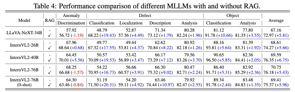 위 Table4에는 IAD task에 특화된 RAG 방식을 적용했을 때의 성능 차이를 확인할 수 있는데요. 보시면, RAG 방식으로 domain 지식을 추가했을 때 여러 모델이서 MMAD 성능이 크게 향상된 것을 확인할 수 있습니다. 특히 defect classification과 object classification 부분에서 성능 향상이 크게 향상이 되었는데, 이는 domain knowledge안에 그 카테고리에 대한 정보가 많이 포함되어 있기 때문이라고 볼 수 있습니다. 또, localization 성능도 3~4% 정도 향상된 걸로 봐서 text 기반 정보로 image에 대한 perception 능력이 향상시켰다고 볼 수 있겠죠.