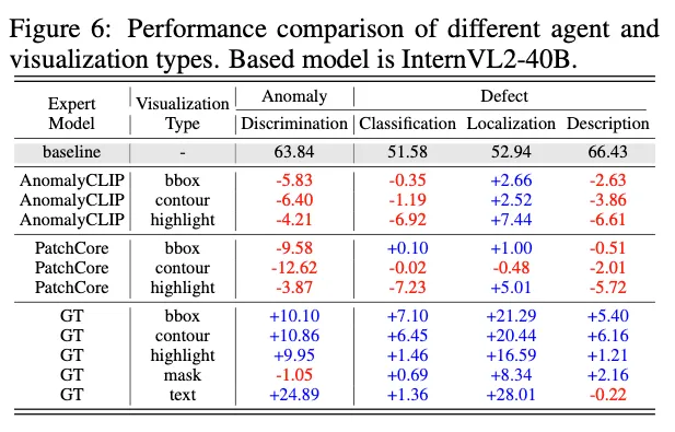 위 Table6에서는 AnomalyCLIP, PatchCore, GT를 expert로 사용함으로써 성능 향상폭을 확인하였습니다. 이때 visualization type도 bbox, contour, highlight 3가지로 두었습니다. 결과를 보시면 AnomalyCLIp과 PatchCore에서는 defect localization에 대한 성능 향상만 있을 뿐 다른 subtasks, discrimination이나 classification에서는 오히려 성능이 떨어지고 있습니다. 반면에 GT를 직접적으로 사용한 경우에는 모든 task에서 성능 향상을 보이며, 특히 localization과 관련된 부분에서 엄청난 성능 향상을 보이고 있습니다. 이를 보아 현재 expert model의 output을 MLLM이 사용하기에는 정확도가 부족하다고 할 수 있습니다. expert model output을 사용했을 때는 성능이 약간 오르거나 대부분 떨어진 반면에 gt를 사용한 경우에는 전반적으로 크게 성능향상이 되는 것을 보면 말이죠.