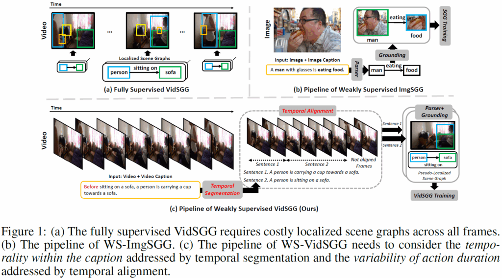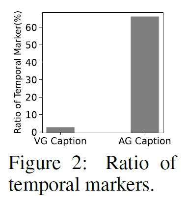 위 Fig.1(b)의 이미지 캡션과 다르게, 비디오 캡션에는 ‘before’, ‘while’, ‘then’, ‘after’와 같은 temporal marker가 많습니다. 이들이 가진 시간에 대한 정보를 고려하지 않고 나이브하게 학습을 진행시키면 모델에 틀린 정보를 정답 신호로 제공할 위험성이 있습니다. 위의 Figure1.(c)에서 캡션에 포함된 ‘before’를 무시하고 <persion, sitting on, sofa>라는 관계를 앞쪽 프레임의 학습에 사용한다면 모델이 잘못된 정답값을 가지고 학습을 하게 되겠죠? 통계적으로 ImgSGG에 대표적으로 사용되는 Visual Genome 데이터셋에는 temporal marker가 2%비율로 나타나지만, VidSGG에 사용되는 대표적인 데이터셋인 Action Genome의 캡션에는 65%정도의 비율로 포함되어 있다고 합니다. 따라서, 비디오 캡션을 활용하려면 여기에 포함되어 있는 temporal 정보를 적절히 활용해야 합니다.