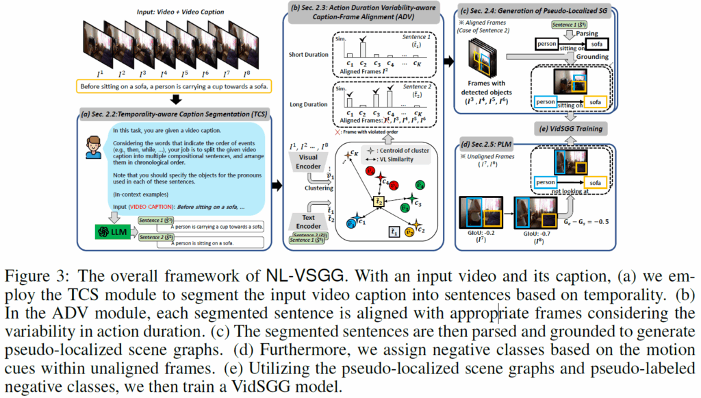 이에 대해, 저자들은 Natural Language-based Video SceneGraphGeneration(NL-VSGG) 라는 weakly supervised VidSGG 프레임워크를 제안합니다. 해당 프레임워크는 VidSGG 모델 학습에 명시적인 scene graph 정답값을 활용하지 않고, 비디오 캡션만을 활용해 학습을 진행합니다. 프레임워크는 크게 TCS(Temporality-aware Caption Segmentation)모듈과 ADV(Action Duration Variability-aware Caption-Frame Alignment)모듈로 구성되는데, TCS 모듈은 LLM을 활용해 시간적 정보를 고려해서 비디오 캡션을 분할하고, ADV 모듈은 이렇게 분할된 캡션들을 action duration을 고려해 비디오 내 캡션들과 정렬합니다. 여기서 각 프레임에 대해 K-Means로 클러스터링을 수행하고, 각 캡션들을 해당 클러스터 중심과 유사도를 측정하여 클러스터 내 프레임들과 매칭하는 방식으로 캡션과 프레임들을 자동 정렬시켰습니다. 다양한 실험 결과, 이렇게 Weakly Supervised learning을 수행하는 방식이 1. 사전학습된 ImgSGG 모델을 사용하는 방법과 2. WS-ImgSGG 파이프라인을 그대로 VidSGG에 적용하는 것보다 좋은 성능을 보였다고 합니다.