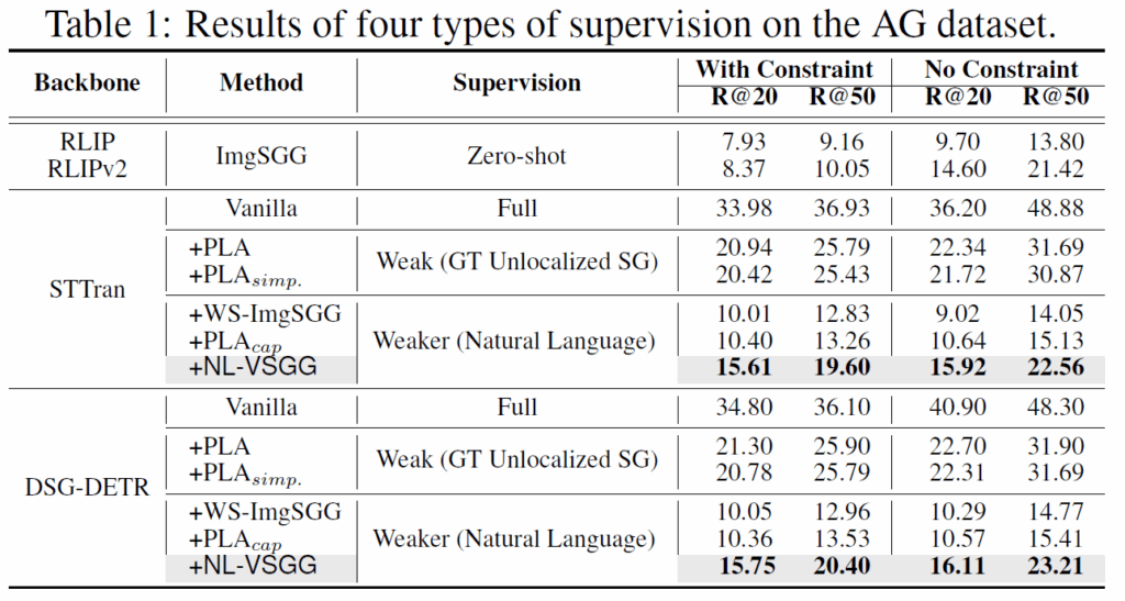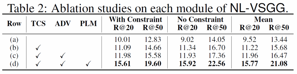- 우리는 Action Genome에서 다양한 실험을 통해 제안하는 NL-VSGG가 우수함을 입증하였다.