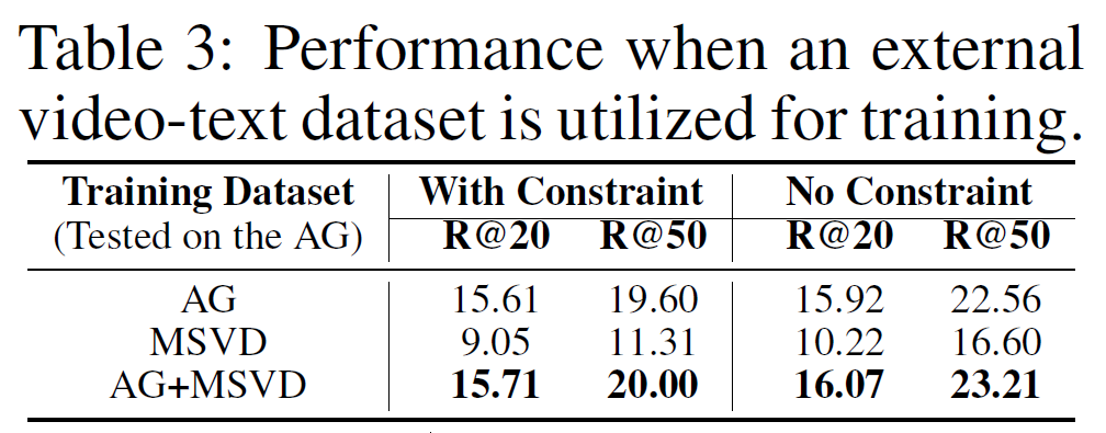 기존의 VidSGG는 Action Genome 데이터셋에 국한된 한계를 보였는데, 제안하는 NL-VSGG는 외부 video-text 데이터셋인 MSVD를 함께 사용했을 때 좋은 결과를 보여줍니다. action genome은 실내 위주의 장면이고, MSVD는 실외 장면을 포함하기 때문에 다양한 도메인의 video-text pair 수집이 도움이 될 수 있다고 분석합니다.
