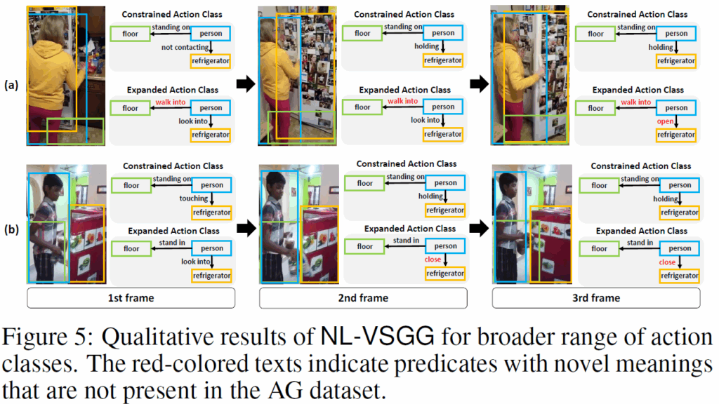 마지막으로, Figure 5에서는 학습 데이터(Action Genome)에 포함되지 않은 action class도 예측 가능함을 보여줍니다. 빨간색 텍스트는 AG데이터셋에 포함되지 않은 novel class predicate인데, video caption만을 사용하여 학습을 했기 때문에 어찌 생각하면 당연하게도 novel class에 대한 예측을 수행할 수 있습니다.