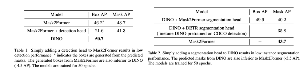 그래서 저자는 transformer 기반 모델들도 CNN기반 모델들 처럼 두가지 태스크가 통합된 아키텍쳐를 통해서 탐지와 세그멘테이션이 서로 도움을 줄 수 있을 것이다라고 믿고 여러가지 실험을 하였지만, 위 테이블과 같이 DINO(detection 하는 친구)를 세그멘테이션을 단순히 사용하거나 Mask2Former(segmentation하는 친구)를 detection에 사용하는 실험결과가 그리 좋지 않은 것을 볼 수 있습니다.