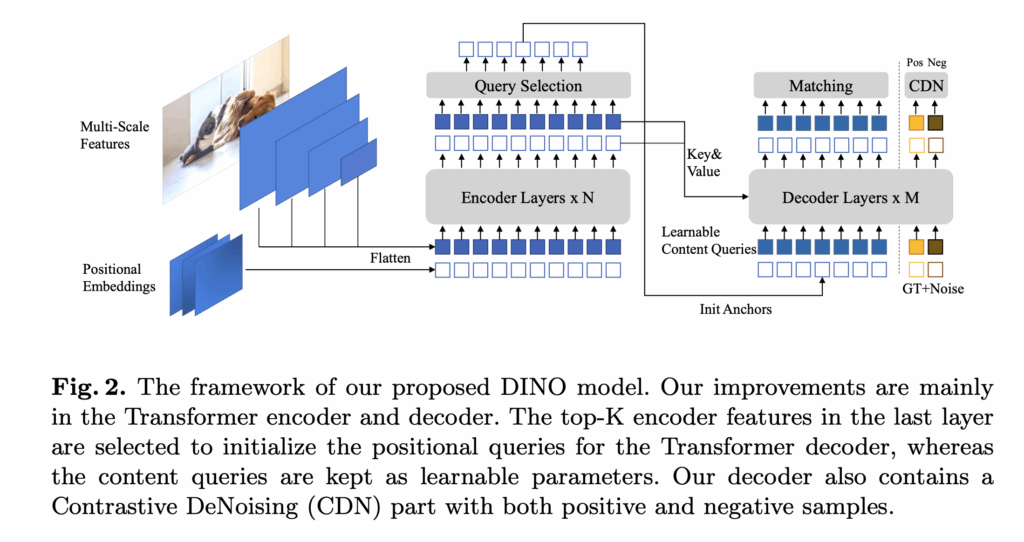 반면에 DINO는 DETR과 거의 유사하게 쿼리를 통해 bounding box를 직접 회귀하도록 설계되어 있습니다. 이 쿼리들은 저 수준의 세밀한 픽셀 정보와 직접적인 뭔가 상호작용은 하지 않도록 설계되어 있고, 대신 객체의 위치 정보와 고수준의 시멘틱 정보를 활용해서 객체-level에서의 탐지에 포커스를 두고 있습니다.