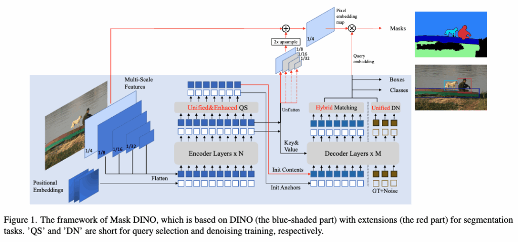 Mask DINO는 기존 DINO 구조에 Segmentation을 위한 마스크 브랜치를 추가합니다.