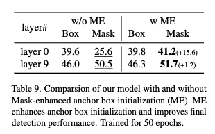 위 테이블을 보시면 Mask로부터 도출한 앵커 박스를 탐지 쿼리로 초기화에 사용했을 때 박스 예측에 있어서 성능이 향상되는 것을 알 수 있습니다.