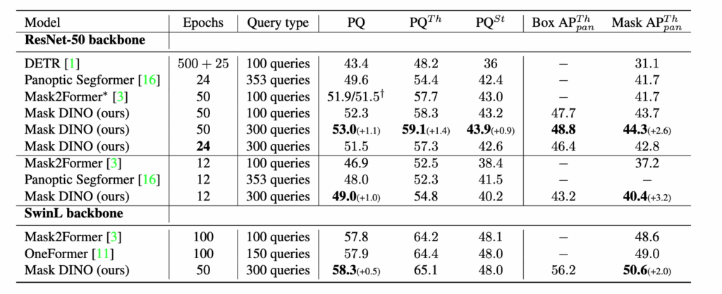 중요한 건 Mask2Former가 segmentation에 특화된 모델이라는 점을 감안했을 때 segmentation 성능이 더 높은 것은 물론이고 탐지 성능 또한 DINO보다 +0.8 AP 더 높았다는 것을 보실 수 있습니다. 게다가 수렴속도도 훨씬 빠릅니다.(24epoch만에 44.2 AP, Mask2Former의 50epoch 결과보다 높음)