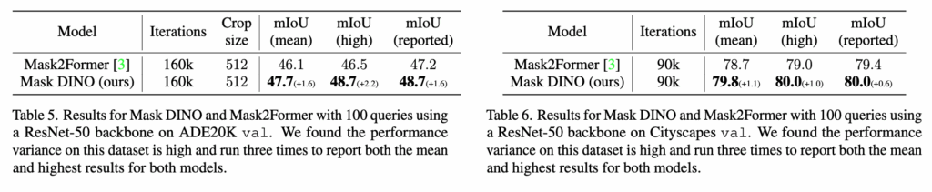 sementic segmentation또한 둘 다 Mask2Former 대비 더 좋은 성능을 기록했습니다.
