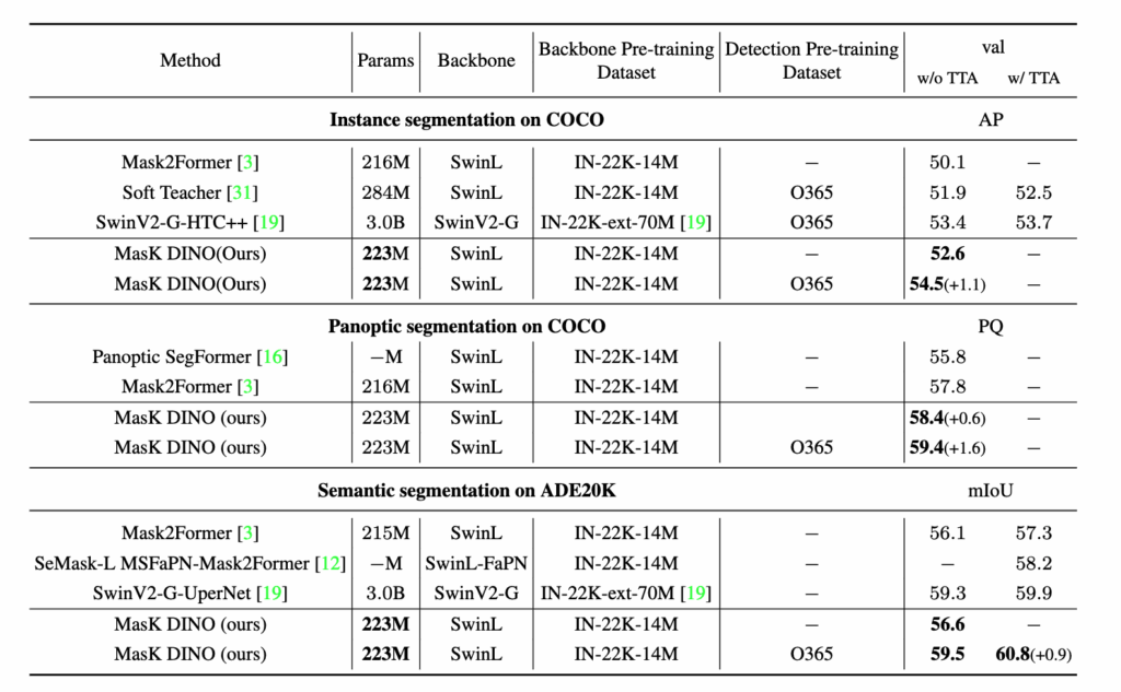 이번에는 스케일을 좀 더 키워서 Swin-L 백본 + Objects365로 사전학습된 DINO 기반에서 Mask DINO를 파인튜닝한 실험 결과를 살펴보도록 하겠습니다.
