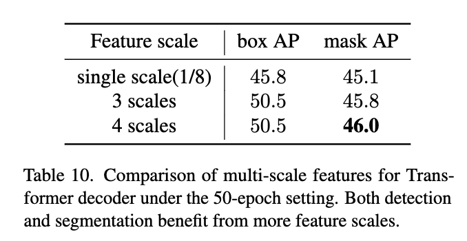 Mask DINO는 오히려 다중 스케일 특징을 활용할수록 성능이 증가하는 것을 확인하실 수 있습니다. 이건 아마도 Mask DINO가 detection 기반 구조이기 때문에
