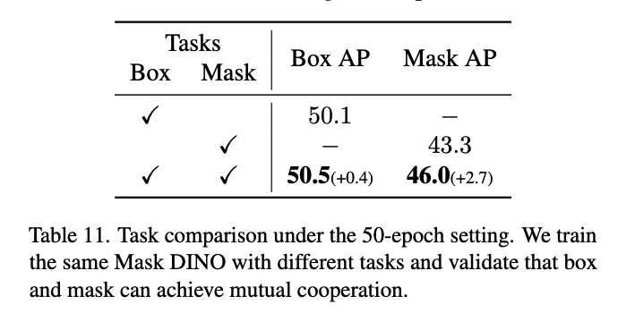 table 1번의 두번째 칸을 보시면 세그멘테이션 모델에 detection헤드(DINO 방식 활용)를 붙혀서 멀티 태스크를 수행했을 때의 결과를 보시면 박스 성능도 떨어지고 마스크 성능도 떨어지는 것을 확인하실 수있는데 특히 박스 성능이 엄청 떨어지는 것을 볼 수 있습니다. Mask2Former라는 친구는 세그멘테이션하는 친구라 저 Box AP를 측정할 때 Box를 마스크결과로 생성한 것이라 공정한 비교는 어려울 수 있겠지만 DINO라는 친구의 Box성능과 비교했을 때 이것보다 좋지 않기 때문에 기존의 탐지모델과 기존의 세그멘테이션 모델보다 성능이 좋지 않으며 오히려 박스 성능은 처참하게 하락된다 라는 분석을 할 수 있습니다.