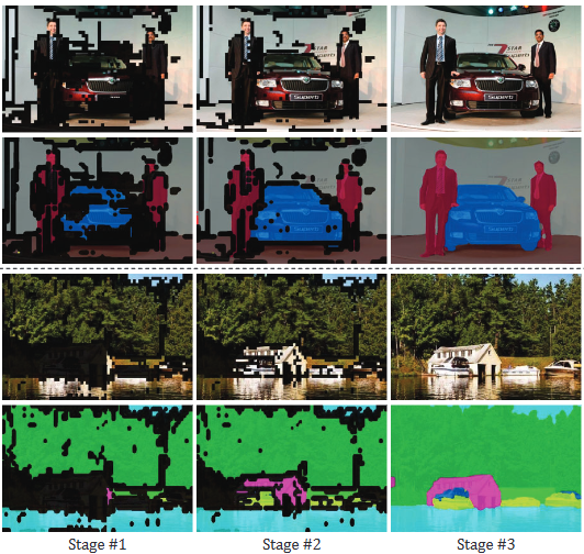 Fig 1은 이 과정을 보여줍니다. Stage #1에서는 비교적 예측이 쉬운 토큰들에 대해 예측을 수행한 후 (검은색 영역은 예측이 어려운 토큰을 의미함), 경계 영역, 작은 객체와 같은 비교적 어려운 토큰들은 깊은 레이어 (Stage #2-#3)에서 수행됩니다. 여기서 하나의 힌트를 얻어가네요. 객체의 경계부는 중심부에 비해 Segmentation 시 더 어려운 토큰에 해당한다.