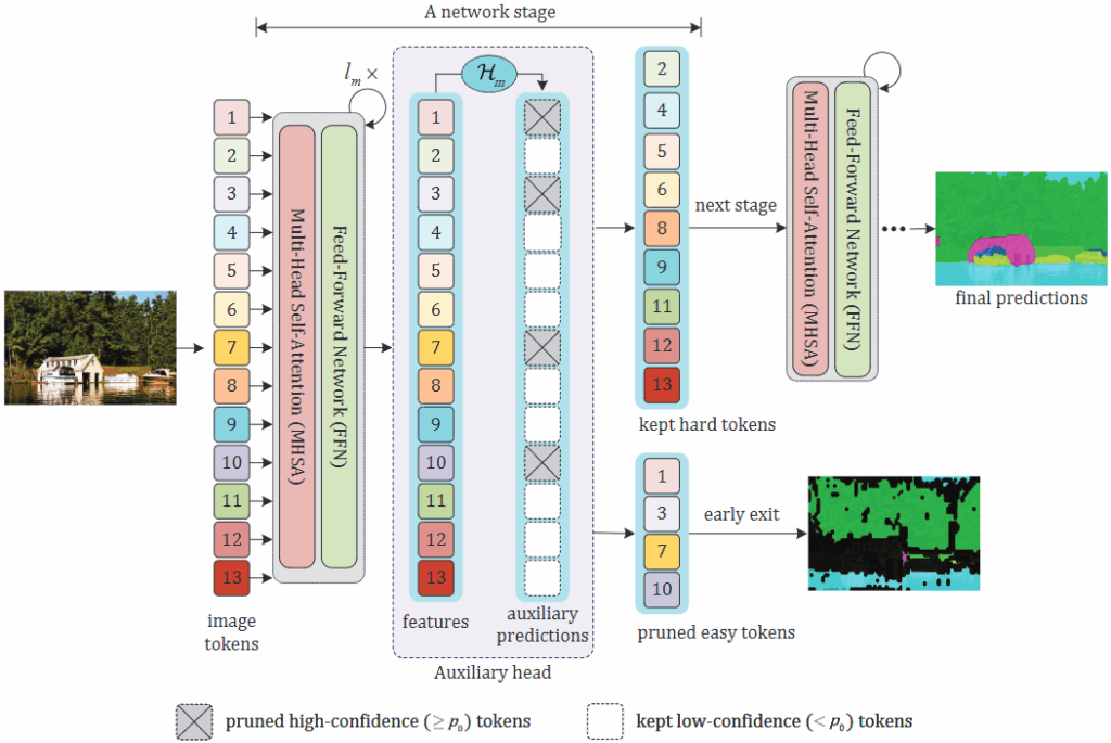 앞서 언급한 단계는 조기 종료(Early exit)라고 불리는 단계로, 쉬운 토큰은 이른 단계에서 예측을 수행한 후 이후 레이어를 통과시키게 하지 않습니다. 물론, 이 예측하는 토큰들이 더 많은 레이어를 통과하면 더 정확한 예측을 수행하겠지만, 지금의 목적은 Efficient이기에 이들을 적절히 제거시킴이 더 중요합니다. 위 Fig 2는 ViT 백본을 M 단계로 분할하며, 각 단계의 마지막 레이어에서는 보조 블록 \mathcal{H}_{m} 을 활용해 토큰의 난이도를 평가합니다. 이 난이도라 함은 본래 토큰 별 예측 결과에 대한 확률값입니다. 이, 해당 토큰 예측 결과 P_m 에 대해 사전에 정의한 Threshold인 0.95와 비교하여 이상의 값을 가지는 것은 쉬운 토큰으로 간주되어 이후의 연산에서 제거되며, 그 외는 어려운 토큰으로 다음 레이어로 계산이 이어집니다. 여기서 저자는 다음의 직관을 주장합니다. “Since a token is a natural representation of an image patch, we can finalize the prediction for easy tokens in adadvance without the need for complete forward computing by mimicking the segmentation process of humans” 번역하자면, image tokens는 image에 대한 자연스러운 표현이므로, easy token을 구별해내는 것은 계산 없이도 사람의 segmentation 과정을 모방하여 사전에 처리할 수 있다고 합니다. 그리고 이 과정을 위에서 말한 조기 종료(Early exit)라고 부릅니다. 그리고 앞서 말한 보조 블록 \mathcal{H}_{m} 은 ViT에 이미 내재한 각 스테이지 마지막의 블록입니다 (새로 학습하는 블록이 아님에 유의). 이 블록은 원래 ViT 기반 segmentation에서는 CNN보다 gradient의 흐름이 느리고 어렵기 때문에 세밀한 정보를 초기 레이어에서 유지시킴이 필요합니다. 따라서 중간 레이어의 출력으로도부터 segmentation prediction을 하여 보조적인 loss를 학습시킵니다. 이는 훈련을 안정화하고 성능향상에 기여하는 역할을 합니다 (단, loss용이므로 inference 시에는 버립니다). 즉, 다시 말해 이는 원래의 ViT 기반 segmentation에 존재하였던 것입니다. SegFormer, SegViT와 같은 방식들이 모두 이러한 auxiliary head를 가지고 있습니다. 그렇기에 m번째 레이어의 출력 Z_{l_m} 으로부터 \mathcal{H}_{m} 을 통과시킨 prediction을 P_m 이라 하며, 이에 대해 특정 토큰이 예측에 대한 confidence score가 높을 시에는 (그 토큰이 어떤 영역에 대해 segmentation 했는지는 당장은 상관없이), 그 토큰은 easy token이기에 다음 레이어에서부터는 제거합니다. 이 때의 Threshold를 0.95로 엄격하게 정의한다는 의미죠 (실험적으로 설정함).
