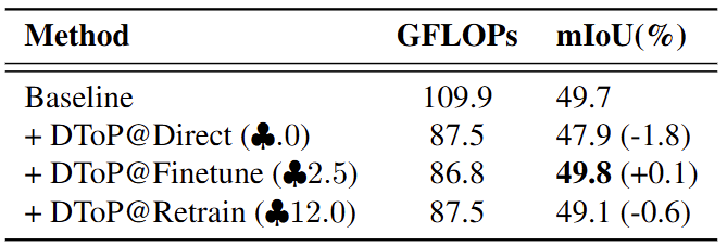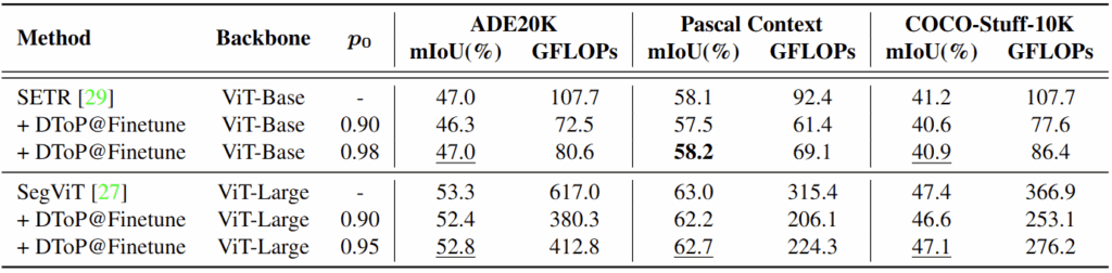 본 방법론은 총 세 가지의 데이터셋 (ADE-20K, COCO-Stuff-10K, Pascal-Context)에서 평가되었습니다. 위 Tab. 1은 ViT에서 제안하는 방법 (DToP)에 대해 학습 여부에 따른 성능 차이를 보입니다. @Direct, @Finetune, @Retrain에 대해선 각각 Training-free, fine-tuning, all-training입니다. 저 세잎클로버는 추가적으로 필요한 학습 시간을 의미합니다. 결과적으로는 전체를 Retraining하는 것 보다, Segmentation head만 fine-tuning하였을 시, GFLOPs도 낮아질 뿐더러 (Fine-tuning하였을 때 더욱 효과적으로 Token Reduction을 수행한다는 의미로 해석 가능함) 성능은 Baseline에 비해 오히려 높아지는 모습을 보입니다.