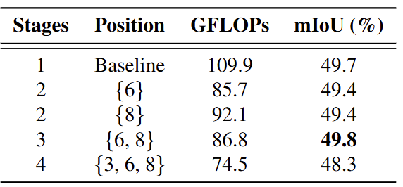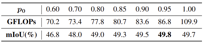 위 Ablation study로부터 하이퍼파라미터 등을 설정한 이후 SETR, SegViT와 같은 다른 ViT Segmentation 모델들에 대해 실험하였을 때도 GFLOPs가 그래도 꽤 유의미하게 줄어드는 모습을 볼 수 있습니다. 성능도 1% 내외로는 항상 보존되어 그래도 성능면에서는 분명 유의미합니다.