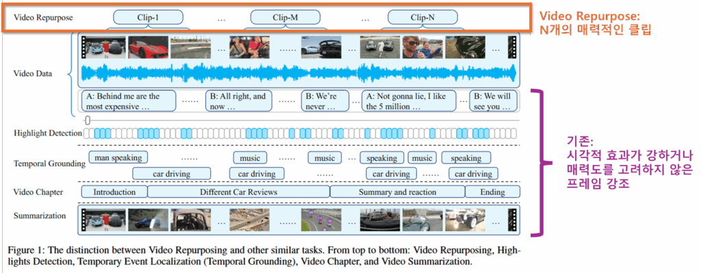 정리하면, 해당 논문은 원본 영상을 기반으로 매력적인 짧은 클립을 생성하기 위한 Video Repurposing 테스크를 정의했고, 이를 위한 대규모 데이터셋인 Repurpose-10K과 벤치마크를 제공했다는 점에 큰 의의가 있습니다.