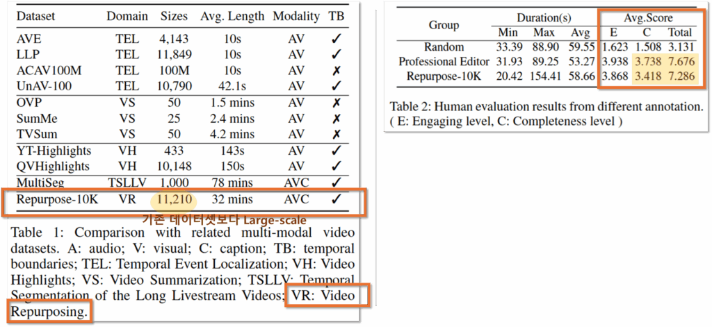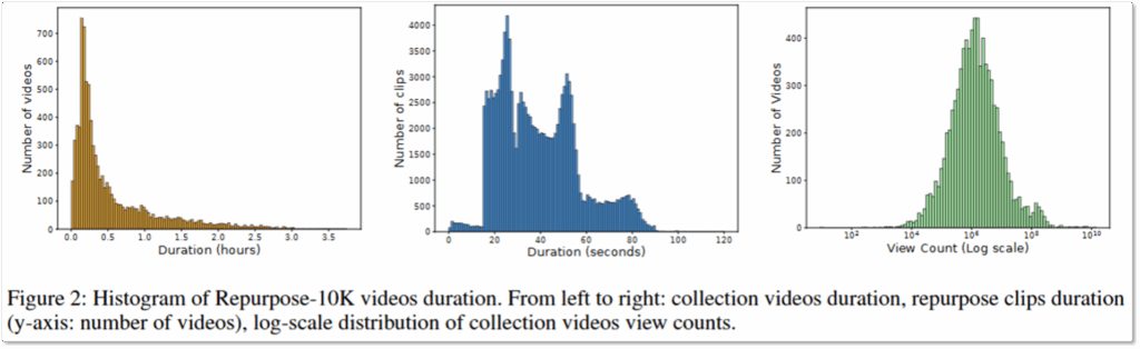 (장점1) Large-scale. 저자들은 사용자 생성 콘텐츠 비디오의 경우 (아마도 주관적인 주제가 많고 노이즈가 많기 때문에) 모델이 학습에 있어 데이터의 양이 중요하다고 주장하며 Repurpose-10K의 비디오 개수가 기존 데이터에 비해 많은 점에 있어 이점을 갖는다고 합니다. 또한 평균적으로 32분의 비디오로 길이 또한 긴편입니다.