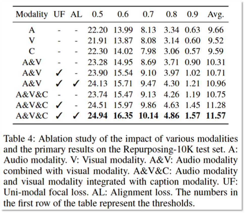 다음으로 제공된 실험은 ablation study입니다. 실험에 사용된 프레임워크가 유의미한 구조임을 보이기 위한 실험으로 모달리티가 추가됨에 따라 성능향상을 확인할 수 있으며, 사용된 목적함수(UF:unimodal focal loss, AL:Alignment loss)가 추가됨에 따라 역시 성능이 향상됨을 확인함을 통해 이를 검증하였습니다. 주목할 점은 단일 모달리티를 활용할때 (특히 IoU threshold가 낮을 때) caption 활용이 가장 효과적이였다는 점이라고 합니다. 이를 통해 video repurposing 작업에 캡션이 중요하며, 설계한 프레임워크의 캡션 가이딩이 유의미한 이유라고 설명했습니다.