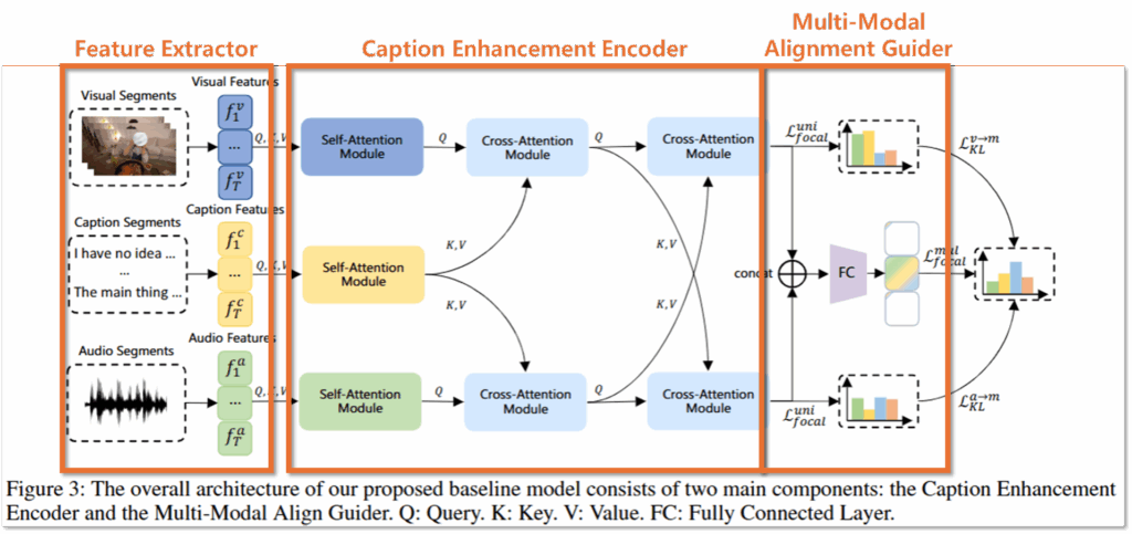 데이터셋을 제시했다면, 해당 데이터셋의 솔루션을 제시해야합니다. 일반적으로 제시한 데이터셋이 너무 쉽거나 어렵지 않게 “이제 연구를 시작해도 될만한” 난이도로 잘 구축되었음을 증명하는게 해당 프레임워크 설계와 실험 벤치마크 제시의 목적인것 같습니다. 논문에서 제시하는 프레임워크는 Figure3과 같으며 클립 영역에 대한 regression과 영역이 인게이지먼트 요소가 있는 유의미한 클립인지 이진 분류하는 classification 테스크를 동시해 수행하도록 설계했습니다. 구조는 Feature Extractor와 Caption Enhancement Encoder, Multi-Modal Alignment Guider 세 가지 요소로 꽤 간결하게 설계되었습니다.